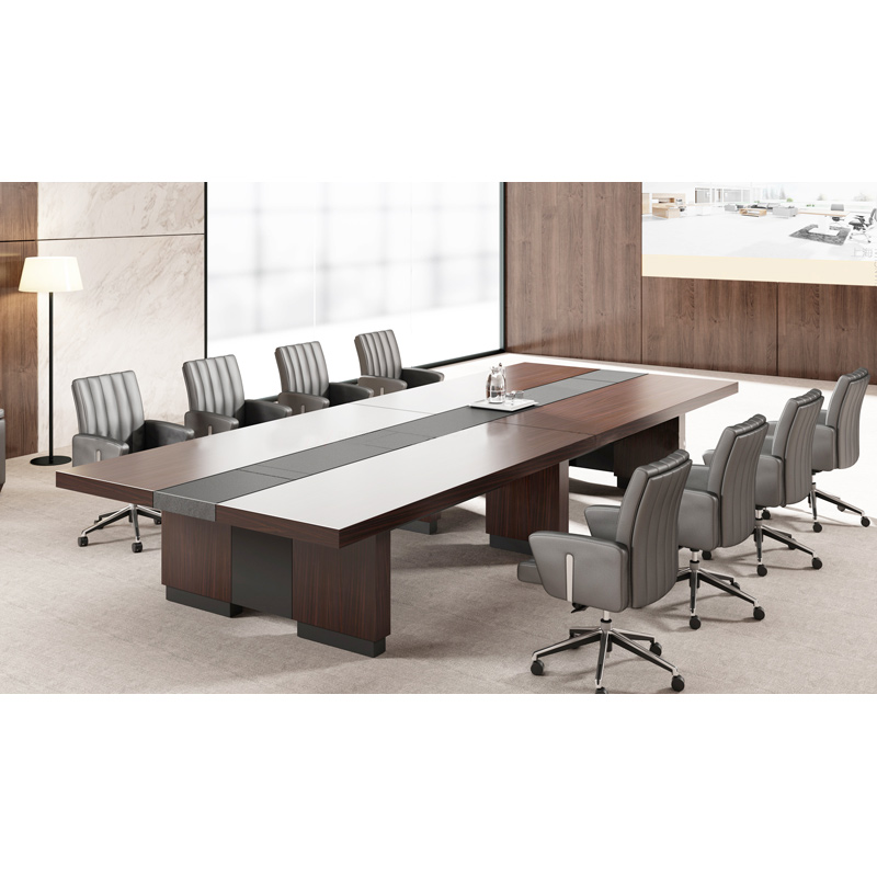 配置:鋼管制桌腳及橫梁系統,50mm厚矩形桌板,1只T腳,1件長邊柜。T腳圍板及邊柜門板與支撐線盒為黑(或白)色高光油漆;底盤包拉絲不銹鋼板;配1個桌機線盒;小關面貼拉絲鋁板;阻尼門鉸,阻尼三節軌;邊柜在使用者左手位為左。
